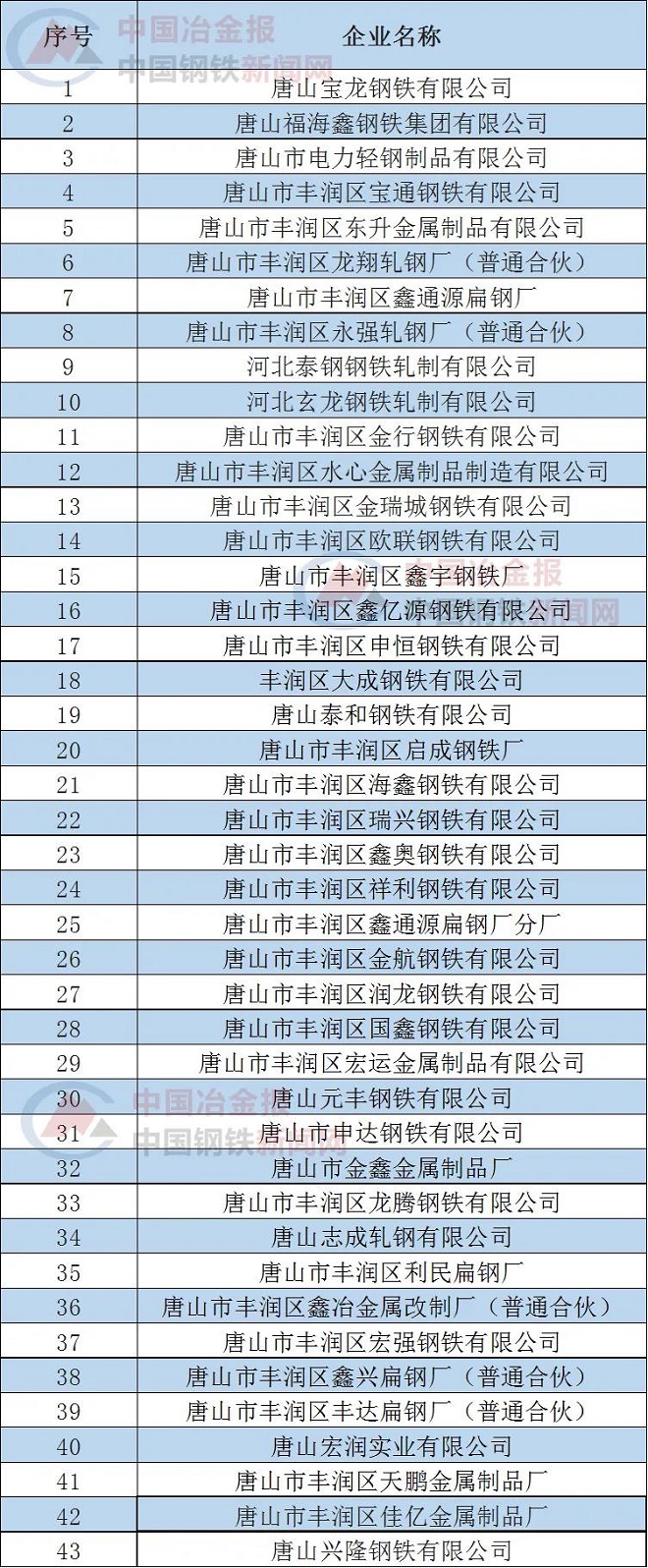 按照《唐山市獨立軋鋼行業整治提升工作方案》,唐山市生態環境局組織鋼鐵行業專家對唐山市部分獨立軋鋼企業進行了現場驗收,并從2021年8月18日開始分批予以公示。截止目前,共有43家獨立軋鋼企業通過驗收。具體名單如下: