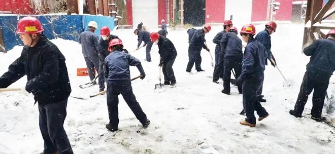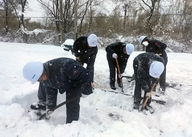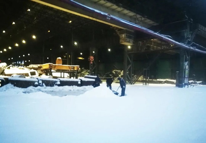 面對暴雪突襲,鞍鋼股份鲅魚圈鋼鐵分公司職工自夜間開始清掃積雪,保障生產順利進行。
