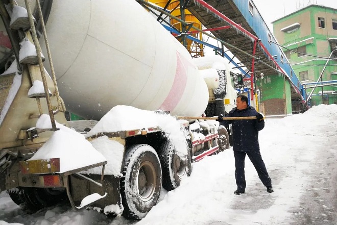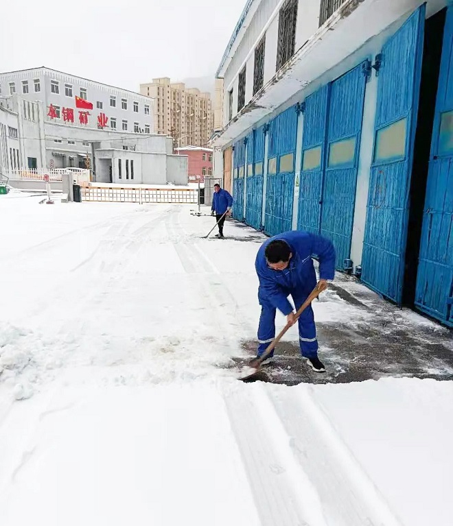 鞍山鋼鐵耐火材料公司夜班職工交班后,與白班同志一同清理廠區積雪,排查安全隱患,做好鞍山鋼鐵冶金石灰熔劑保產保供工作。