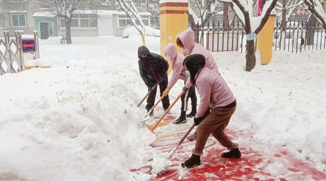 根據鞍山市教育局《關于應對極端天氣變化的緊急通知》精神,全市學校和幼兒園停課一天,鞍鋼眾元產業幼教中心機關及各幼兒園員工仍徒步來到各自單位值守,對積雪及時進行清理。