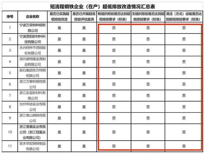 文件還發布了浙江省短流程鋼鐵企業(在產)超低排放改造匯總情況: