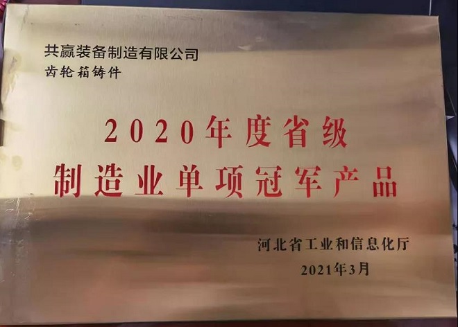 2020年,共贏裝備榮獲省級制造業“單項冠軍”產品稱號,省級制造業“單項冠軍”代表著細分行業最高的發展水平、最強的市場實力,是制造企業的第一方陣、“河北制造”的排頭兵。