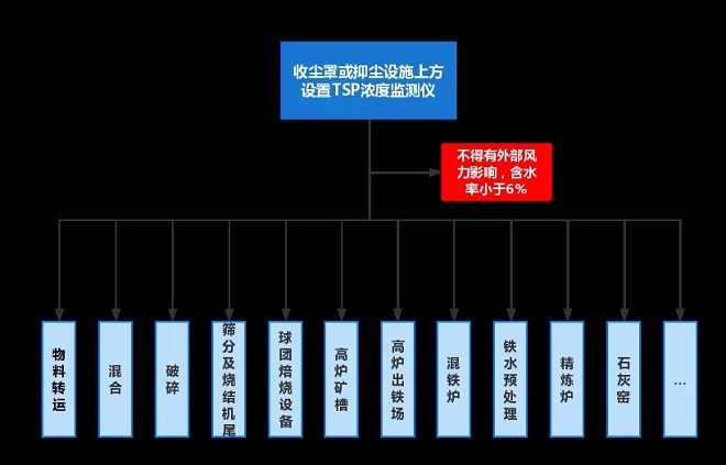 產塵點顆粒物監測設施的布點方式可參考《鋼鐵企業超低排放改造技術指南》文件要求:含水率小于6%的物料轉運、混合、破碎、篩分,及燒結機尾、球團焙燒設備、高爐礦槽、高爐出鐵場、混鐵爐、鐵水預處理、精煉爐、石灰窯等主要產塵點,在收塵罩或抑塵設施上方設置TSP濃度監測儀,不得有外部風力影響。