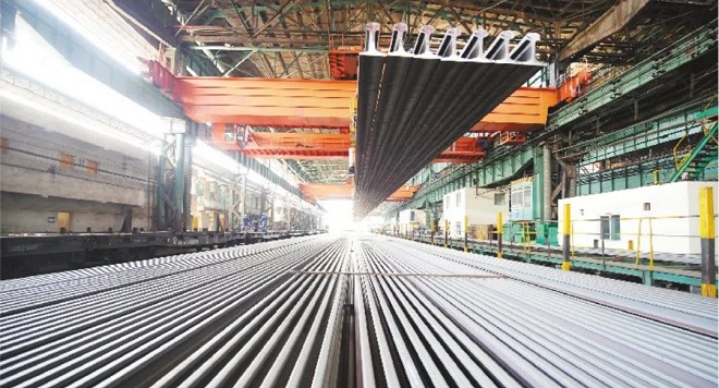 鞍鋼集團(tuán)鞍鋼股份大型總廠生產(chǎn)的百米鋼軌正在裝車。