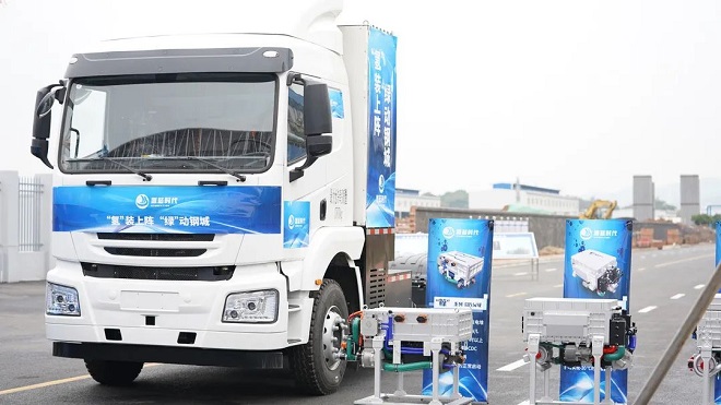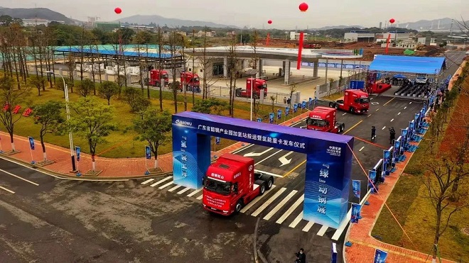 接著,六輛氫能重卡駛進加氫站內加氫區域,工作人員對車輛進行加氫。每臺氫能重卡加氫量約為20公斤,加氫完畢后,車輛隊伍整裝待發。隨著韶鋼松山領導發令“發車”,六輛加滿氫能源的氫能重卡按既定路線駛出加氫站,在領導、嘉賓們的矚目、祝福中,徐徐開進韶鋼生產區域,從今天開始,它們載著綠色制造的使命、美好生活的夢想,將韶鋼鋼鐵制造帶入一個嶄新的氫能時代。
