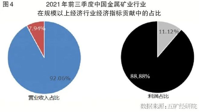 根據國家統計局的數據,2021年前三季度,我國金屬礦業(包含有色金屬礦業、黑色金屬礦業、有色金屬冶煉及壓延加工業、黑色金屬冶煉及壓延加工業)實現營業收入12.95萬億元、錄得利潤總額7054.4億元,分別占前三季度規模以上經濟行業營業收入的7.94%、利潤額的11.12%,支撐了我國經濟的增長。