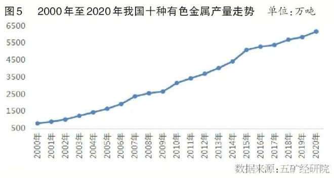 根據國家統計局的數據,2020年我國10種有色金屬產量為6168.0萬噸,同比增長5.5%,2000年后始終保持年同比正增長。在2020年的產量中,電解鋁3708萬噸,精煉銅1003萬噸,精煉鋅642.5萬噸,鉛644.3萬噸,鎳(金屬量)約130萬噸(含鎳生鐵)。這5種商品合計產量約為6128萬噸,占10種有色金屬產量的比例超過99%。