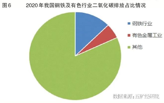 金屬礦業的生產工藝和特點決定了各種金屬的生產均是高能耗、高排放。2020年,中國鋼鐵行業綜合能耗5.8億噸標準煤,折合二氧化碳排放量15.6億噸;有色金屬行業綜合能耗2.5億噸標準煤,折合二氧化碳排放量6.6億噸。兩者合計占當年全國二氧化碳排放總量的近17%,其中,鋼鐵行業占比11.6%,有色行業占比5.0%。