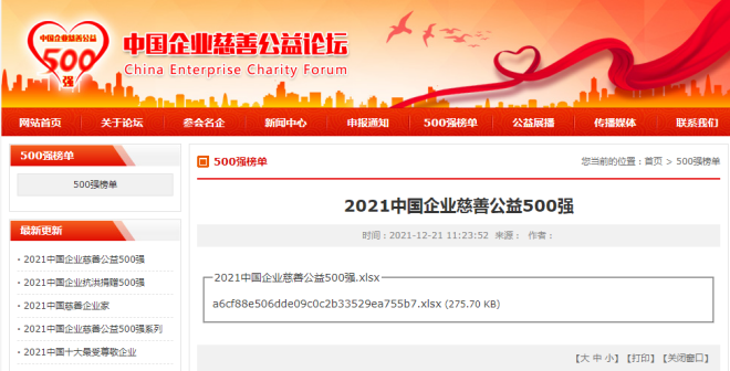 2021中國企業慈善公益500強系列榜單。