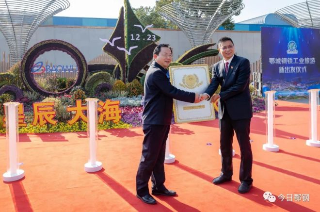 授牌儀式上,鄂州市市委書記孫兵將“國家3A級旅游景區”的牌匾授予鄂城鋼鐵黨委書記、董事長吳琨宗手中。