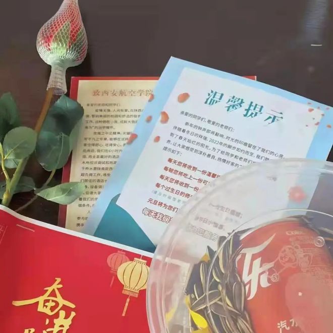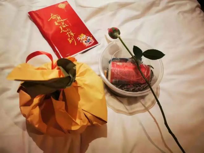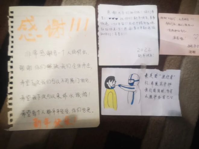 累了就席地小憩,緩沖體力后,再次爭分奪秒與疫情“賽跑”,時刻堅守在疫情防控第一線。大家日復一日用汗水守護著每一位住客的健康,用熱情周到的服務贏得了大家的認可和表揚,收獲了很多來自住客的滿滿愛意。客人在房間門口留下一張張紙片,寫滿了感謝的話語和新年的祝福,都溫暖著每一位員工的心。