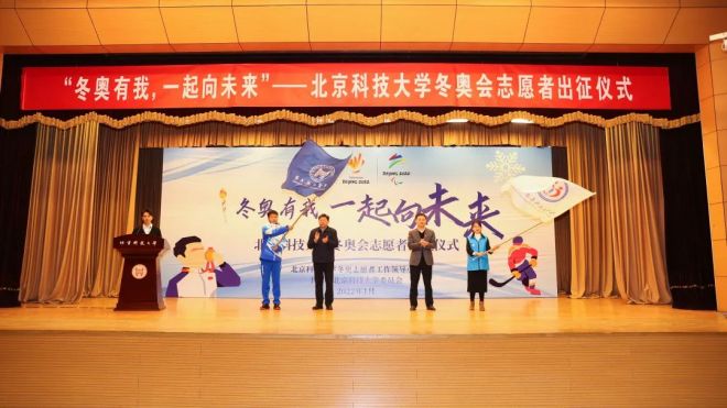 校長楊仁樹、黨委副書記于成文為志愿者代表授旗。志愿者們已然接過了北京冬奧會的接力棒,扛起北科志愿者的旗幟,做好啟程出征的準(zhǔn)備,在2022北京冬奧賽場上綻放光芒。