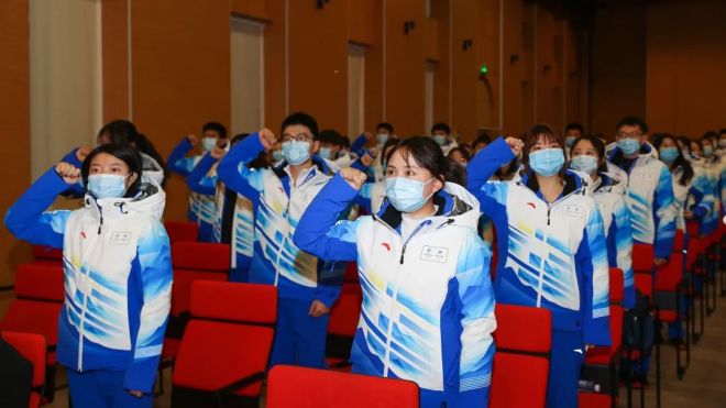 緊接著,黨委副書記于成文宣讀冬奧會志愿者臨時黨、團支部的成立決定。志愿者們組成臨時黨、團支部,在黨旗的引領(lǐng)下建設(shè)強大的志愿者團隊,以實際行動兌現(xiàn)“請黨放心,強國有我”的莊嚴(yán)承諾。