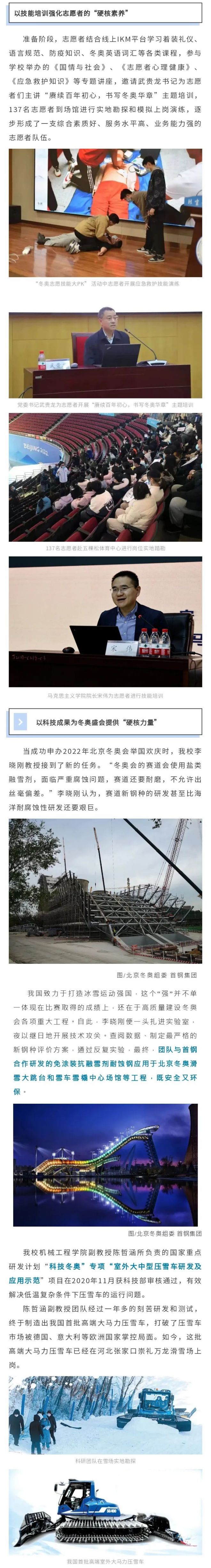 據(jù)悉,在冬奧會期間,我校作為主責(zé)高校承擔(dān)服務(wù)保障五棵松體育中心、五棵松冰球訓(xùn)練館的工作任務(wù),選拔出76名閉環(huán)內(nèi)志愿者、213名閉環(huán)外志愿者、107名城市志愿者,參與體育、交通、人員管理、賽事服務(wù)、通信中心、技術(shù)、贊助企業(yè)服務(wù)、權(quán)益保護(hù)、票務(wù)、志愿者、注冊、防疫、城市引導(dǎo)、測溫通行14個崗位的服務(wù)保障工作。派出152名志愿者完成兩次“相約北京”五棵松體育中心冰球測試活動的服務(wù)保障工作。