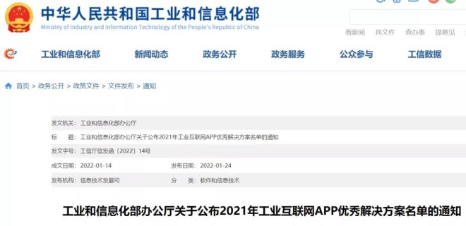 1月24日,工業和信息化部網站發布通知:為貫徹落實國務院《關于深化“互聯網+先進制造業”發展工業互聯網的指導意見》,按照《工業和信息化部辦公廳關于開展2021年工業互聯網APP優秀解決方案征集遴選工作的通知》(工信廳信發函〔2021〕224號)要求,經單位推薦、專家評審、網上公示,確定了132個解決方案為2021年工業互聯網APP優秀解決方案,現予以公布。請各地區、各有關單位加大支持力度,積極推動工業互聯網APP優秀解決方案應用推廣。
