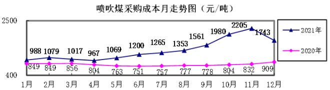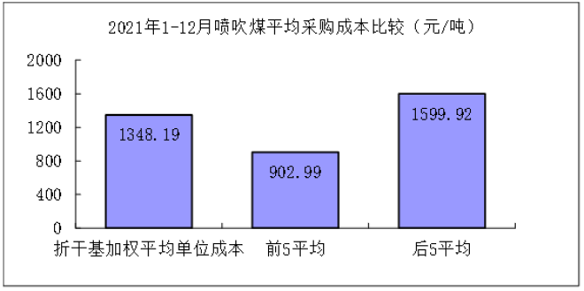 噴吹煤12月份加權平均折算成干基的采購成本為1743.41元/噸,環比下降461.47元/噸,降幅為20.93%。1-12月累計平均折算成干基的采購成本為1348.19元/噸,同比升高533.79元/噸,升幅為65.54%。
