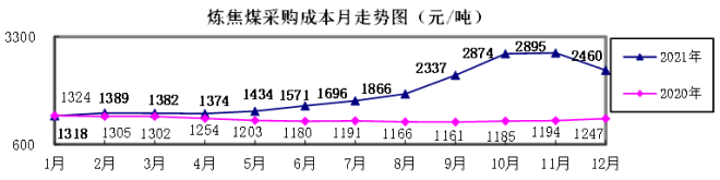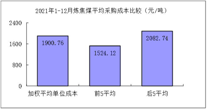 對標企業煉焦煤12月份加權平均折算成干基的采購成本為2460.43元/噸,環比下降434.63元/噸,降幅為15.01%。1-12月累計平均折算成干基的采購成本為1900.76元/噸,同比升高667.97元/噸,升幅為54.18%。