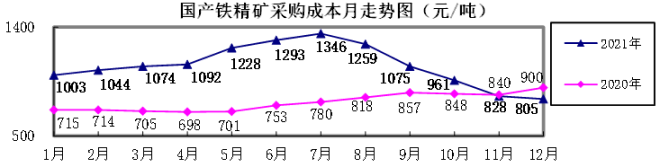 國產鐵精礦(干基)12月份加權平均采購成本為804.83元/噸,環比下降23.42元/噸,降幅為2.83%。1-12月累計平均采購成本為1112.87元/噸,同比升高328.00元/噸,升幅為41.79%。