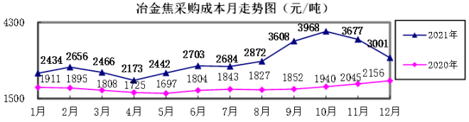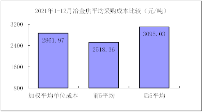 冶金焦12月份加權平均折算成干基的采購成本3000.79元/噸,環比下降666.39元/噸,降幅為18.17%。1-12月累計平均折算成干基的采購成本為2861.97元/噸,同比升高979.14元/噸,升幅為52.00%。