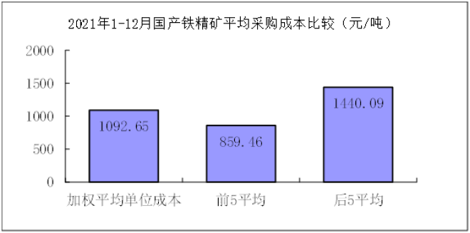 1-12月對標企業國產鐵精礦折算成62%品位的平均采購成本為1092.65元/噸,成本最低的前5家企業的加權平均采購成本為859.46元/噸,比對標企業平均采購成本低233.20元/噸,低于平均采購成本21.34%;而采購成本最高的5家企業的加權平均采購成本為1440.09元/噸,比對標企業平均采購成本高347.44元/噸,高于平均采購成本31.80%。