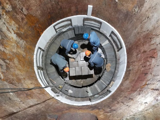 轉爐是煉鋼關鍵設備,以鐵水、廢鋼、鐵合金為主要原料,不借助外加能源,靠鐵液本身的物理熱和鐵液組分間化學反應產生熱量而在轉爐中完成煉鋼過程,寶鋼、梅鋼、湛鋼轉爐承鋼量設有150噸、250噸、300噸、350噸多種規格。大型轉爐耐材砌筑施工工期時間長,磚型復雜,單次爐修耐材砌筑量高達820噸,施工任務艱巨,安全質量管控難度系數極大。此次砌筑“鐵軍”挑戰的是寶鋼二煉鋼250噸的六號轉爐,適逢新春的到來,砌筑“鐵軍”們都選擇留下來,迎戰轉爐砌筑任務。轉爐所用的耐火磚單重約45公斤,最大的單重可達55公斤,平均每個人在12小時內大約需砌筑5噸的耐火磚,“鐵軍”們再一次用鋼鐵般的意志保質保量完成轉爐出鋼口組合安裝、爐底風口芯磚安裝、爐底砌筑、爐身砌筑、爐帽砌筑、爐口澆注等施工任務,保質保量完成爐修砌筑任務,為春節期間的煉鋼生產任務打下堅實基礎。