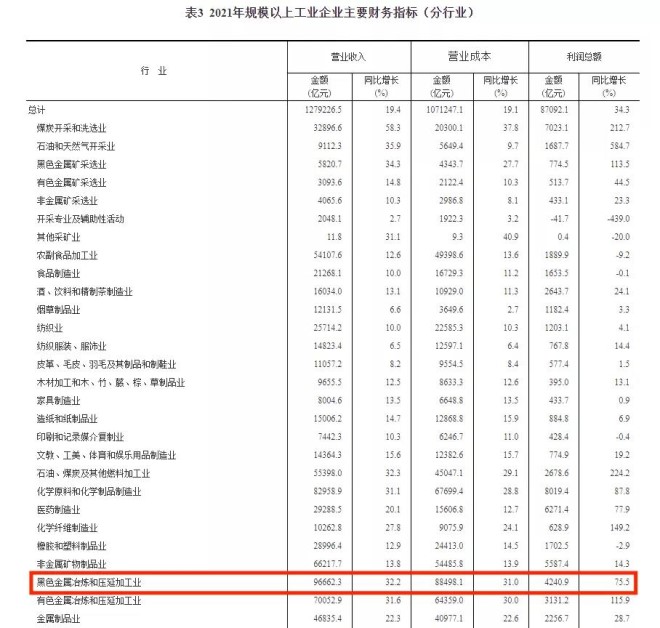 據國家統計局數據顯示,2021年1-12月,黑色金屬冶煉和壓延加工業實現營業收入96662.3億元,同比增長32.2%;營業成本88498.1億元,同比增長31.0%;實現利潤總額4240.9億元,同比增長75.5%。