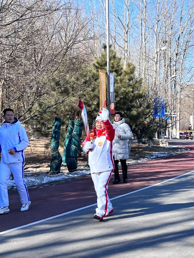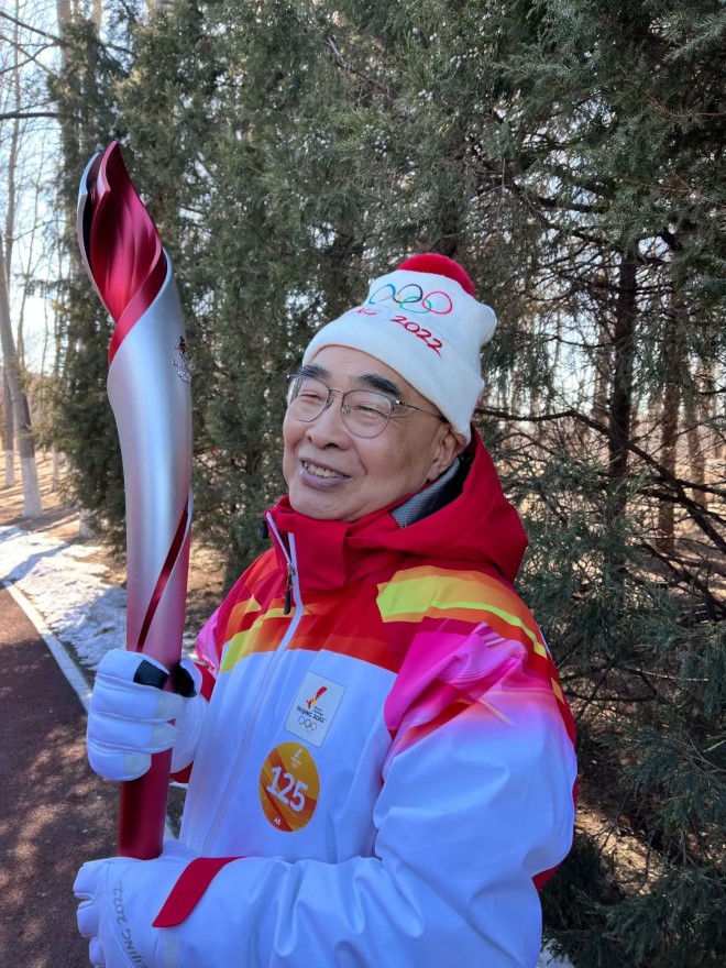 在已進入寒冬的北京,張伯禮身著印有奧運五環(huán)的運動服,高舉冬奧火炬,面帶燦爛的笑容向前奔跑,他的熱情也感染到了在場的觀眾,觀眾們揮舞著五星紅旗和印有北京冬奧會會徽的旗幟,為他吶喊歡呼。