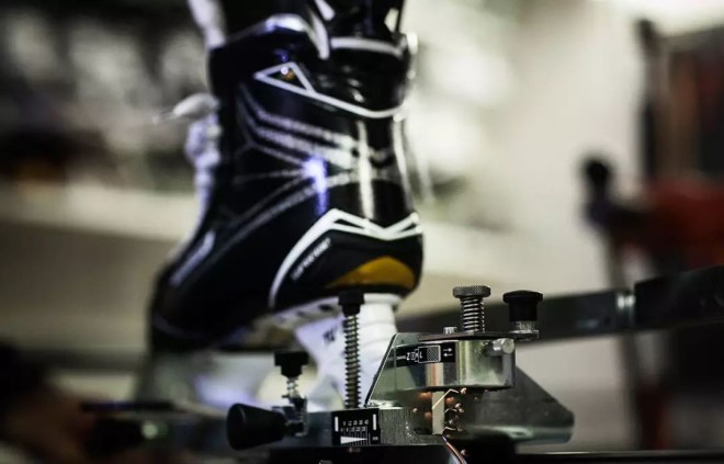 Mattias在自己的代表最新科技水平的自動打磨機上進行演示。他說道:“凹槽越深,你在冰面上獲得的抓力越大,因此你的冰刀會感覺更加鋒利,冰刃部分的保持力更好。雖然較淺的凹槽將會降低抓力,但是更加方便滑行,起停也更加輕松?!彼惹靶枰獙⒈豆潭ǖ綂A鉗上進行手工打磨,但是現在有了打磨機,能夠根據球員的個人偏好,自動打磨出基礎切面,這讓他的工作更加輕松,但同時技術要求也更高。