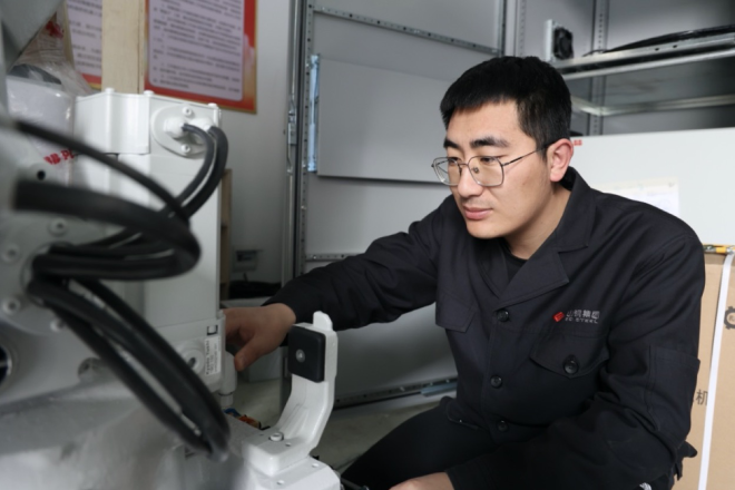機器人代替人工插拔魚雷罐車電氣插頭是研發人員攻克的首道難關。魚雷罐車啟動電源時對插頭插接精度、速度都有極高的要求。為讓機器人插拔插頭時既快又準,研發人員針對現場可能出現的各種影響因素,經反復研討、論證,確定了“機器人+視覺定位”的解決方案。“借助工業相機為機器人裝上‘火眼金睛’,賦予機器人看的能力,從而實現更加精準的插拔操作。”該公司自動化事業部區域師顏偉介紹,“過去,工人手抱20多公斤重的插頭進行操作至少需要20多分鐘,現在機器人一兩分鐘就干完了,既安全又高效。”