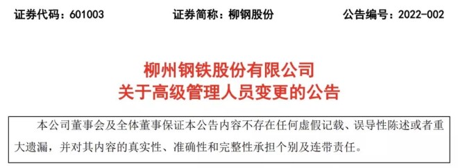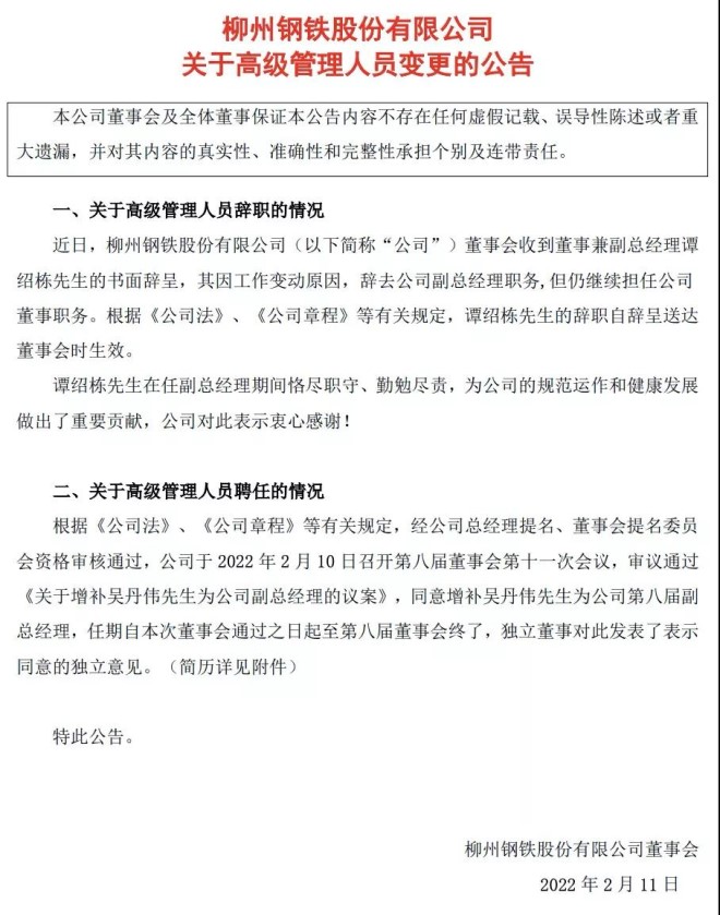 2月10日,柳州鋼鐵股份有限公司發布了《關于高級管理人員變更的公告》(以下簡稱“《公告》”)。從《公告》中獲悉,近日,柳鋼股份董事會收到董事兼副總經理譚紹棟的書面辭呈,其因工作變動原因,辭去柳鋼股份副總經理職務,但仍繼續擔任柳鋼股份董事職務。