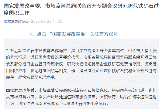 2月23日下午2點25分,國家發(fā)展改革委官微發(fā)部消息稱,針對近期鐵礦石市場供需總體穩(wěn)定、港口庫存持續(xù)上升至多年高位,但價格大幅上漲的異常情況,近日國家發(fā)展改革委價格司、市場監(jiān)管總局價監(jiān)競爭局聯(lián)合組織港口協(xié)會及部分港口企業(yè)召開專題會議,研究大幅縮短貿(mào)易企業(yè)鐵礦石免費堆存期、提高港口囤積成本,防范過度囤積等相關(guān)工作,指導港口企業(yè)敦促鐵礦石貿(mào)易企業(yè)釋放過高庫存,盡快恢復至合理水平。