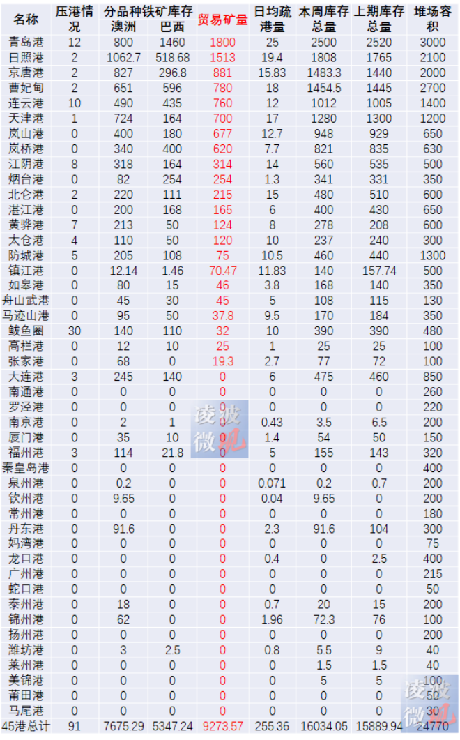 截至2月18日,我國45個主要鐵礦石港口的堆存情況如下:
