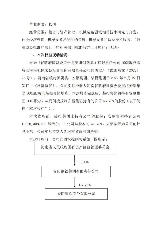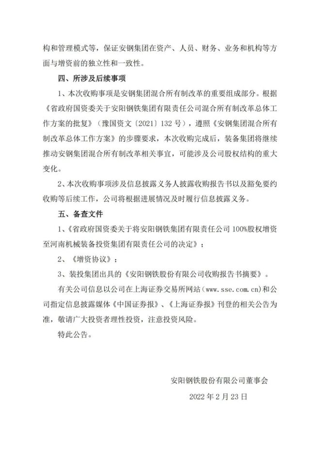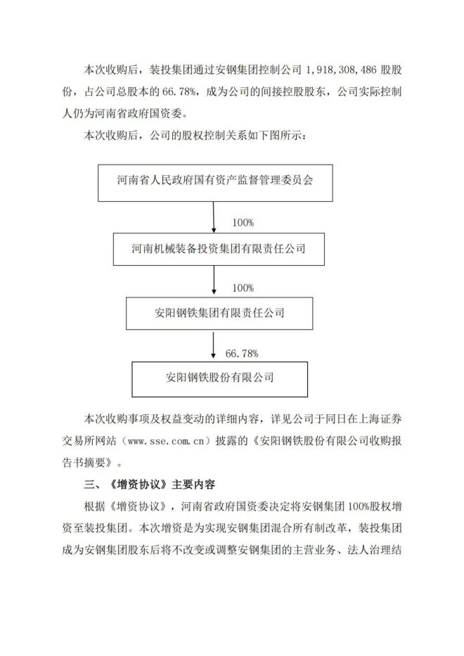 2月23日,安陽鋼鐵股份有限公司(以下簡稱公司)發布《關于控股股東混合所有制改革進展暨股東權益變動的提示性公告》,表示收到公司控股股東安陽鋼鐵集團有限責任公司(以下簡稱安鋼集團)轉來的《省政府國資委關于將安陽鋼鐵集團有限責任公司100%股權增資至河南機械裝備投資集團有限責任公司的決定》(豫國資文〔2022〕26 號),決定將安鋼集團100%股權增資至河南機械裝備投資集團有限責任公司(以下簡稱裝投集團)。本次增資完成后,裝投集團將持有安鋼集團100%股權,從而間接控制安鋼集團持有的公司66.78%的股份(以下簡稱本次收購)。本次收購事項是安鋼集團混合所有制改革的重要組成部分。本次收購完成后,裝投集團將繼續推動安鋼集團混合所有制改革相關事宜,可能涉及公司股權結構的重大變化。