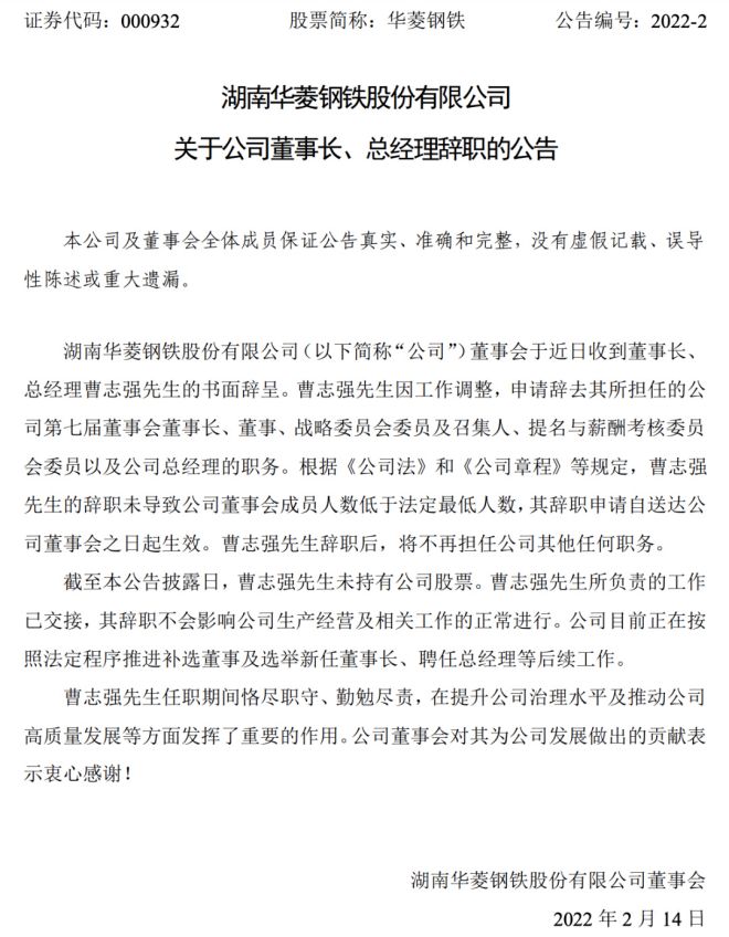 2月14日,湖南華菱鋼鐵股份有限公司發布公告稱,公司董事會于近日收到董事長、總經理曹志強的書面辭呈。曹志強因工作調整,申請辭去其所擔任的公司第七屆董事會董事長、董事、戰略委員會委員及召集人、提名與薪酬考核委員會委員以及公司總經理的職務。