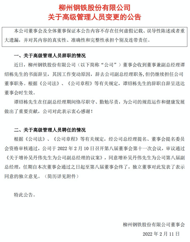 2月10日,柳鋼股份《關于高級管理人員變更》的公告稱,柳鋼股份董事會收到董事兼副總經理譚紹棟的書面辭呈,其因工作變動原因,辭去公司副總經理職務,但仍繼續擔任董事職務;增補吳丹偉為柳鋼股份第八屆副總經理。
