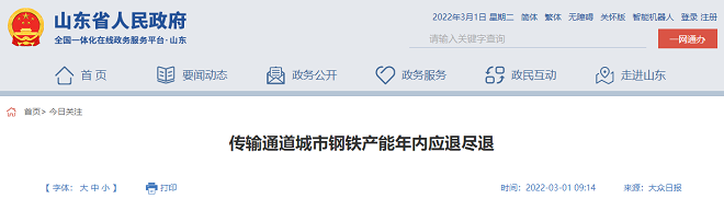3月1日,從山東省人民政府網站獲悉,今年山東堅持降碳、減污、擴綠、增長協同推進,傳輸通道城市(濟南、淄博、濟寧、德州、聊城、濱州、菏澤)鋼鐵產能年內應退盡退。