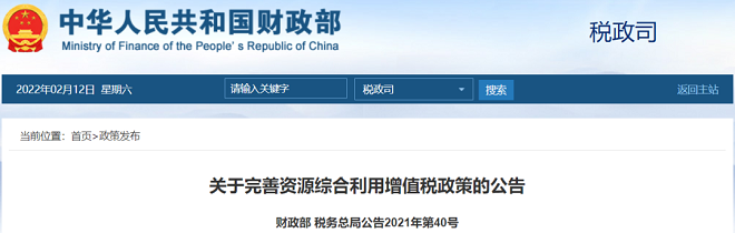 為推動資源綜合利用行業(yè)持續(xù)健康發(fā)展,財政部、國家稅務總局印發(fā)《關于完善資源綜合利用增值稅政策的公告》(財政部 稅務總局公告2021年第40號)(以下簡稱“《公告》”),明確自2022年3月1日起執(zhí)行新的資源綜合利用增值稅政策。