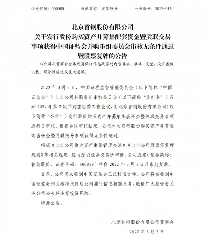首鋼股份3月2日晚間公告,當日,中國證監會上市公司并購重組委召開2022年第2次并購重組委工作會議,對公司發行股份購買資產并募集配套資金暨關聯交易事項進行了審核。根據會議審核結果,公司本次發行股份購買資產并募集配套資金暨關聯交易事項獲得無條件通過。