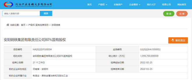 自2月25日起,安陽鋼鐵集團有限責任公司(“安鋼集團”)80%國有股權已在河南中原產(chǎn)權交易有限公司網(wǎng)站進行掛牌,掛牌結束日期為3月25日。