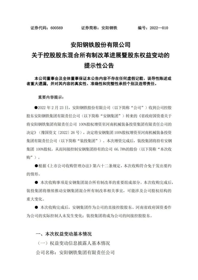 2月25日,安鋼集團將持有的安陽鋼鐵5.74億股股份(占上市公司總股本的20%)無償轉劃至裝投集團,安鋼集團對安陽鋼鐵的持股比例由66.78%降至46.78%。