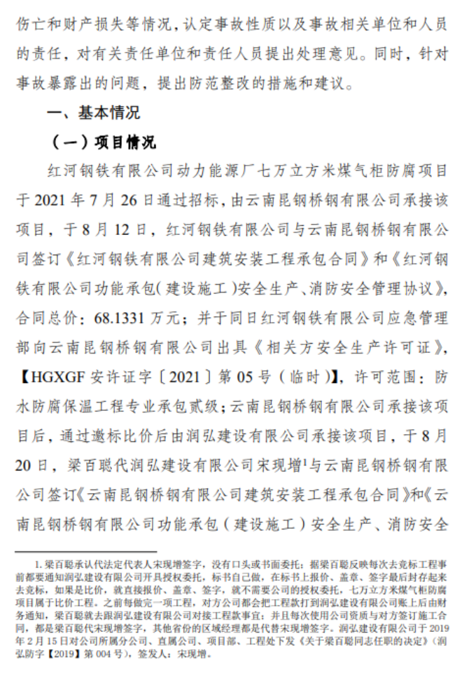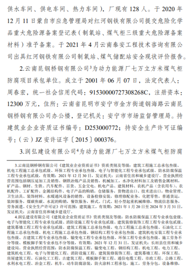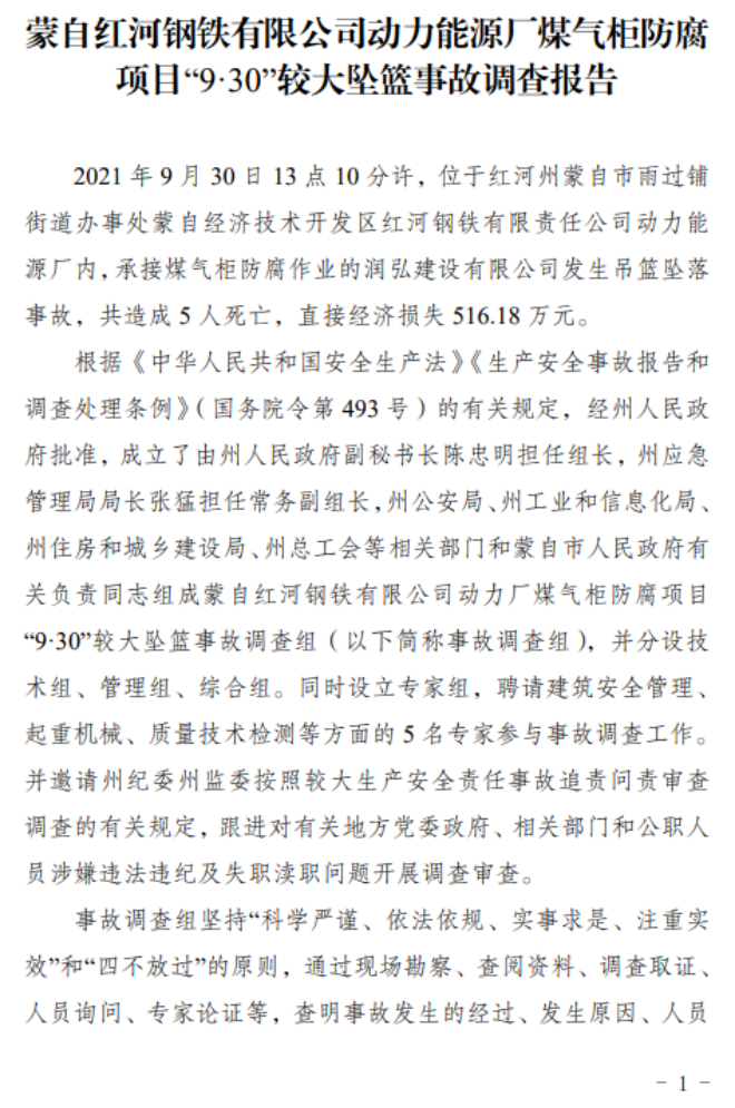 蒙自紅河鋼鐵有限公司動(dòng)力能源廠煤氣柜防腐項(xiàng)目“9·30”較大墜籃事故調(diào)查報(bào)告