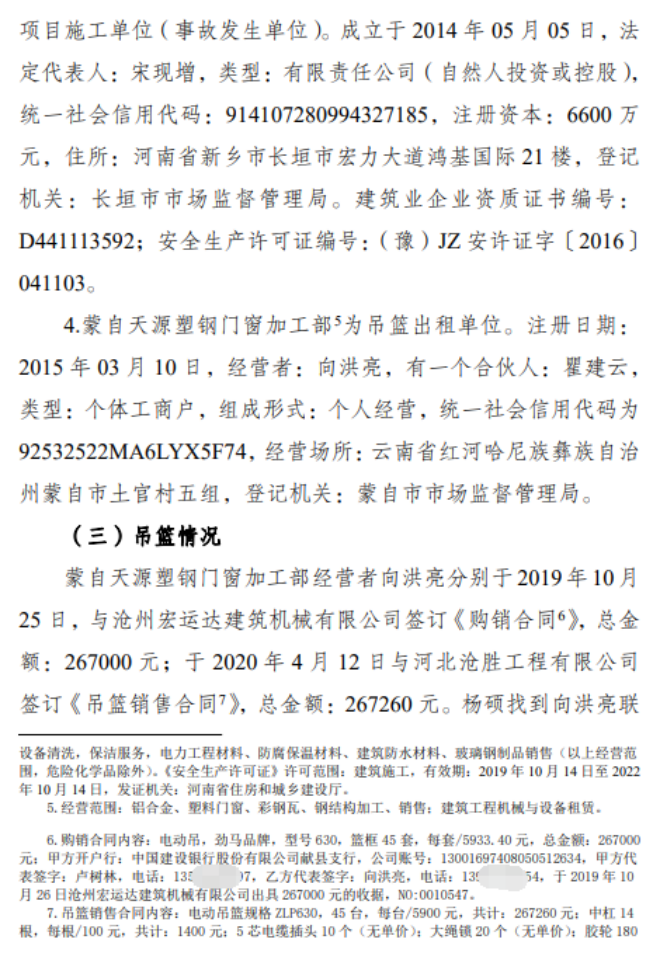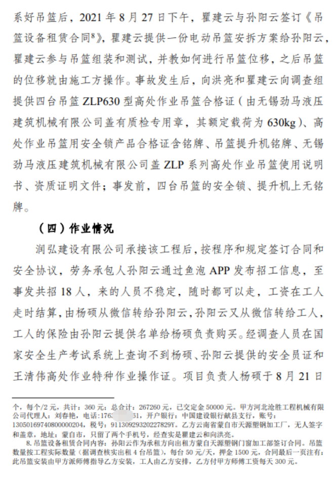 2021年7月26日,紅河鋼鐵有限公司通過(guò)招標(biāo)方式,將“七萬(wàn)立方米煤氣柜防腐”項(xiàng)目交由云南昆鋼有限公司承接,后該公司通過(guò)邀標(biāo)比價(jià)方式將該項(xiàng)目交由河南某公司承接,河南某公司經(jīng)理將該項(xiàng)目全權(quán)交由不具備相關(guān)資質(zhì)的被告人楊某來(lái)負(fù)責(zé),而楊某又以總?cè)斯すr(jià)15萬(wàn)元的價(jià)格將工程交給被告人孫某負(fù)責(zé)施工。2021年8月24日,被告人孫某帶工人正式進(jìn)入紅鋼公司動(dòng)力能源廠煤氣儲(chǔ)備站進(jìn)行除銹、防腐作業(yè)。同年9月30日13時(shí)10分許,因相關(guān)作業(yè)人員違章操作施工吊籃,且嚴(yán)重超員使用施工吊籃,導(dǎo)致施工現(xiàn)場(chǎng)發(fā)生安全事故,造成現(xiàn)場(chǎng)作業(yè)人員五人連同吊籃一起從煤氣柜頂部墜落地面,致使該五名施工人員當(dāng)場(chǎng)死亡。同時(shí)兩被告人楊某、孫某還為負(fù)責(zé)施工的工作人員偽造了特種作業(yè)操作證。