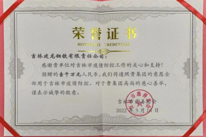 當前,吉林省疫情態勢發展迅猛,連續多天確診病例激增,形勢異常嚴峻。建龍集團董事長、總裁張志祥高度關注吉林疫情情況,要求地處吉林的兩家子公司——吉林建龍、吉林恒聯,在嚴格落實地方政府關于此次疫情防控工作的具體要求的同時,積極履行社會責任,合計向屬地政府捐款1500萬元,助力吉林打贏本輪新冠肺炎疫情阻擊戰。