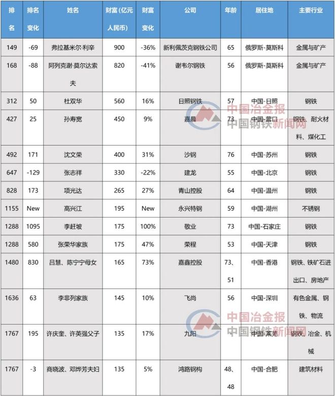 2022胡潤全球富豪榜出爐!看看鋼鐵行業(yè)有哪些富豪上榜