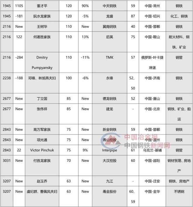 國內(nèi)鋼鐵行業(yè),杜雙華(560億)、方威(465億)、孫壽寬(450億)、沈文榮、張志祥、項光達、高興江、李趕坡、張榮華、董才平、王樹華、劉鋒、丁立國等多位企業(yè)家上榜。