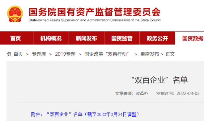 近日,國務(wù)院國資委網(wǎng)站公布了“雙百企業(yè)”名單。
