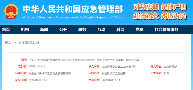 3月22日,應(yīng)急管理部網(wǎng)站發(fā)布了《中華人民共和國(guó)應(yīng)急管理部公告(2022年第4號(hào)):2021年度工貿(mào)行業(yè)安全生產(chǎn)標(biāo)準(zhǔn)化一級(jí)企業(yè)名單》(以下簡(jiǎn)稱“《名單》”)。