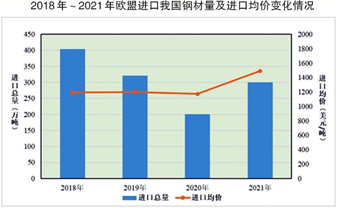 近年來,受歐盟對我國鋼材多次以反傾銷為由征收高額關(guān)稅、新冠肺炎疫情蔓延等因素影響,歐盟自我國進口的鋼材總量整體呈下降趨勢。2021年,歐盟經(jīng)濟恢復(fù)帶動鋼鐵需求持續(xù)復(fù)蘇,鋼材價格普遍上漲,我國出口歐盟的鋼材均價達到1493美元/噸,出口價格優(yōu)勢階段性顯現(xiàn)。2021年,歐盟從我國進口鋼材量達到300萬噸,同比增長49.7%,但仍較2019年下降6.6%。2018年~2021年歐盟進口我國鋼材量及進口均價變化情況如下圖。