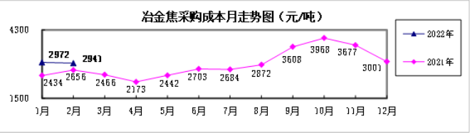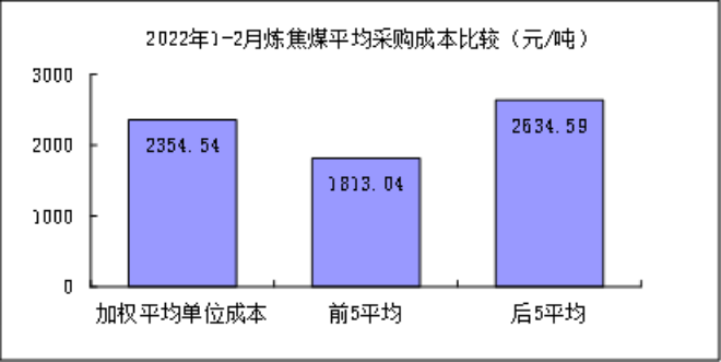 2022年2月,煤焦類產(chǎn)品采購成本高位波動;鐵礦石類產(chǎn)品采購成本繼續(xù)上升。