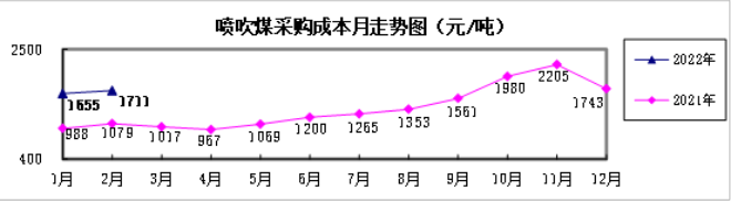 噴吹煤2月份加權(quán)平均折算成干基的采購成本為1710.63元/噸,環(huán)比升高55.67元/噸,升幅為3.36%。1-2月累計平均折算成干基的采購成本為1679.18元/噸,同比升高645.68元/噸,升幅為62.47%。